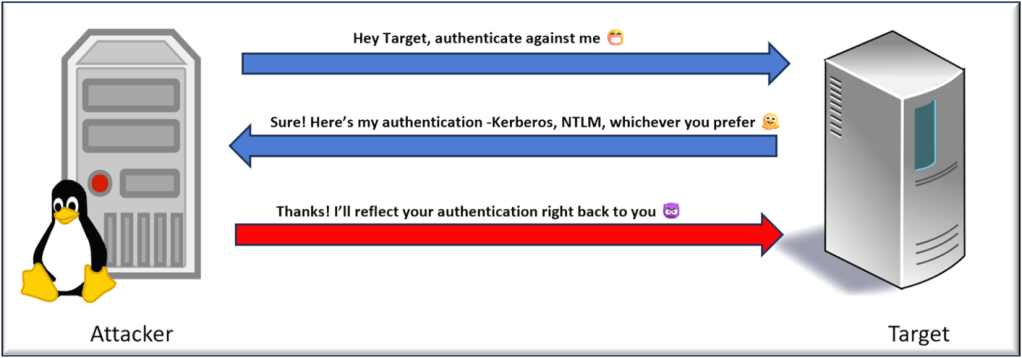 The attacker reflects that authentication attempt back to a service the victim host runs itself.
