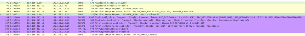 The authentication was forwarded to another domain controller via the Netlogon secure channel (IP address 192.169.213.10), where LmCompatibilityLevel was set to 3. This DC had also the PDC emulator role.