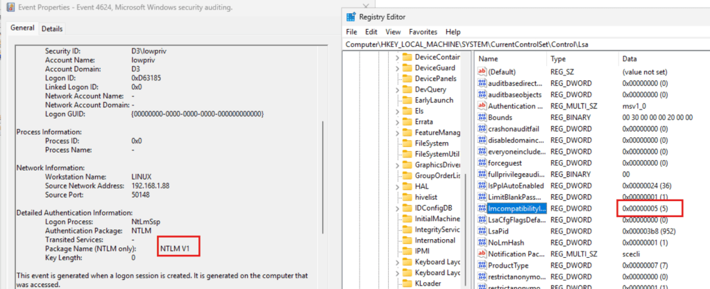 This was also confirmed in the Event Viewer: successful NTLMv1 authentication despite the LmCompatibilityLevel set to 5: