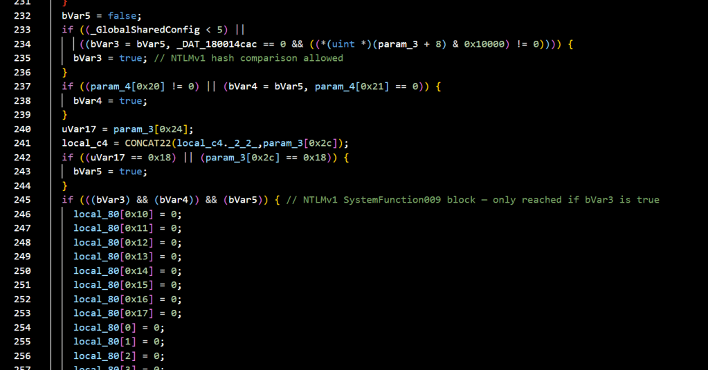 When the level is 5, bVar3 stays false and the NTLMv1 hash comparison is skipped entirely. The function returns false, causing STATUS_WRONG_PASSWORD. Back in MsvpSamValidate() ,in msv1_0.dll , the Authoritative flag is never set to 1 for this error, it stays at the default 0.