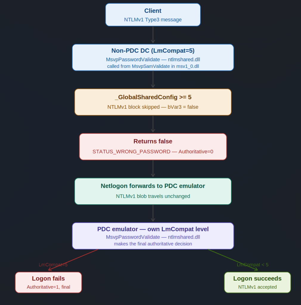 Netlogon interprets Authoritative=0 as “this DC cannot give a definitive answer” and forwards the NTLMv1 blob unchanged to the PDC emulator, which runs the same check under its own LmCompatibilityLevel.